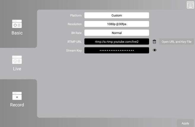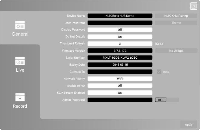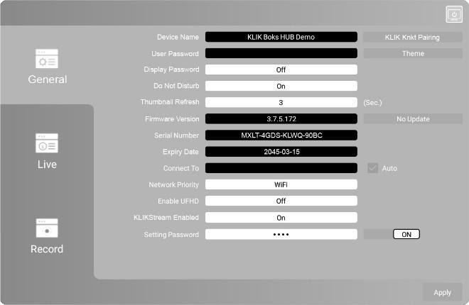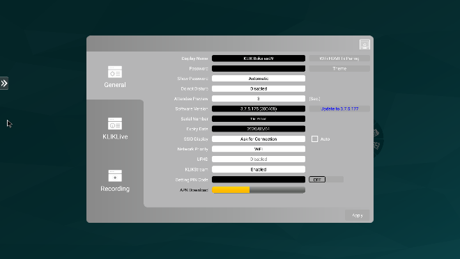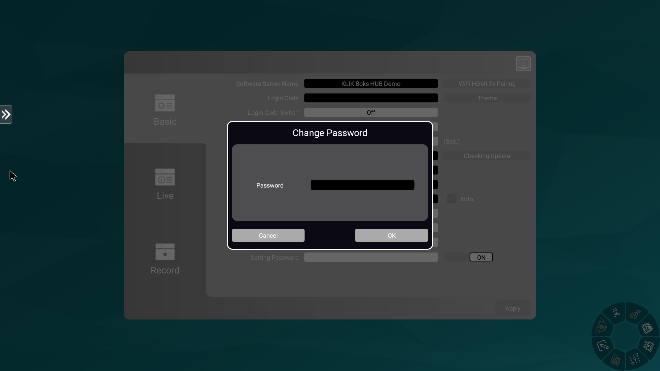 When enabled, a password is required either to stream to the KB1200 or to view the stream remotely using KLIKStream. The password consists of a four-digit number and is appended to the KB1200 KLIKStream address in this form: /1234 (e.g. 192.168.43.1:9090/1234)